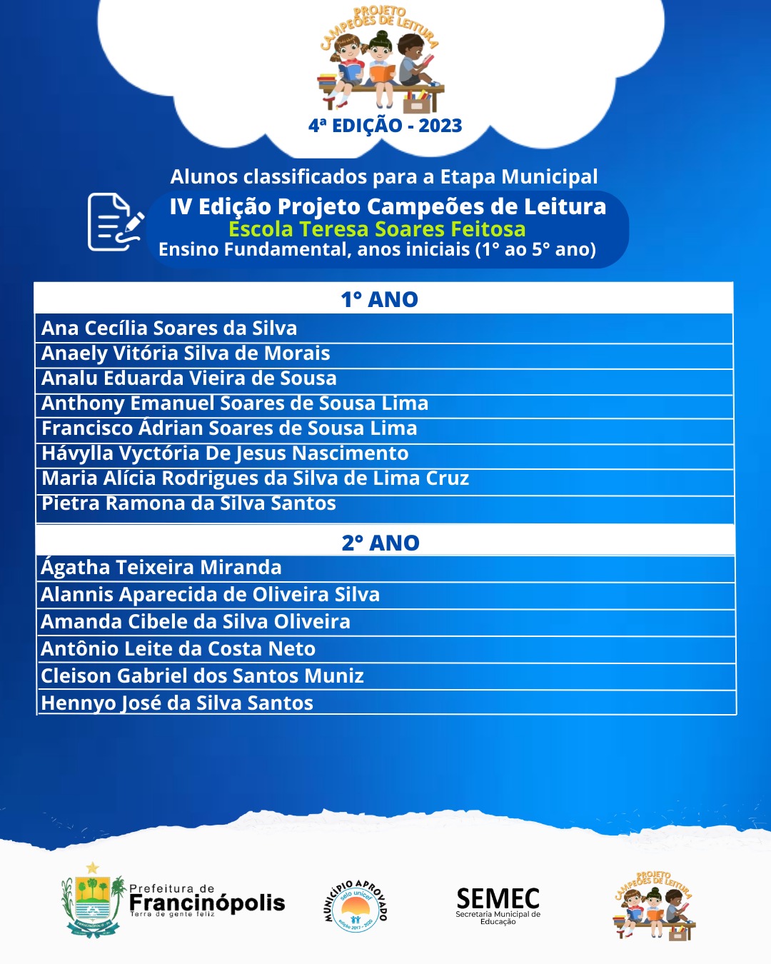 A Prefeitura de Francinópolis, através da Secretaria de Educação, irá realizar no proximo dia 4 de novembro a 2ª etapa (Oficina Municipal) do Projeto Campeões de Leitura. O Projeto tem como público alvo-beneficiado os alunos de 1º ao 9º ano do Ensino Fundamental e da Educação de Jovens e Adultos - EJA, matriculados na rede municipal de ensino. Durante o período letivo, os alunos foram estimulados pelos professores a ler, interpretar as obras e produzir textos.