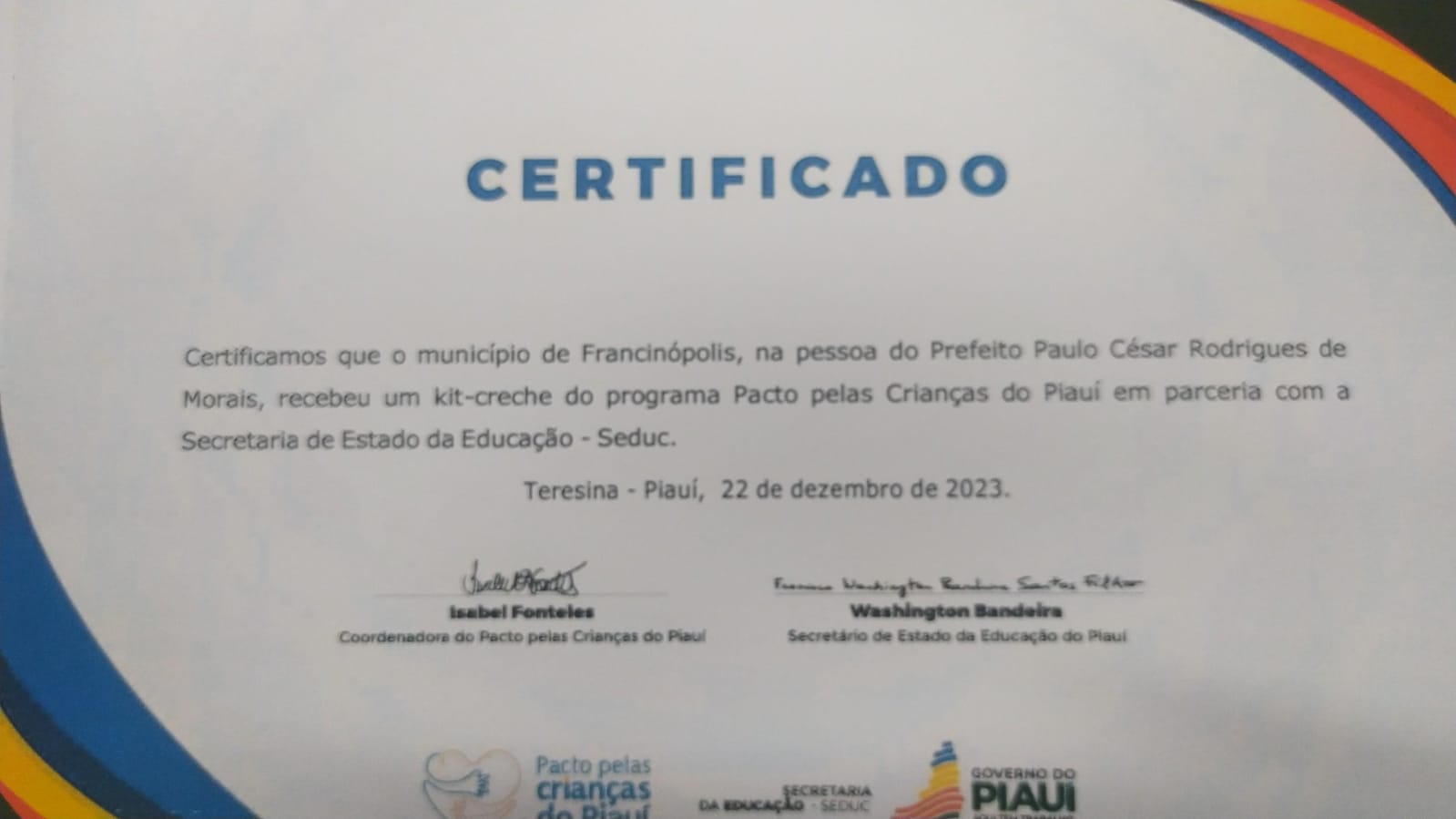 O município de Francinópolis foi um dos beneficiados com o kit mobília creche, no valor de 200 mil reais. O Certificado foi recebido pela Secretaria de Educação do Municipio, Eliane Morais.