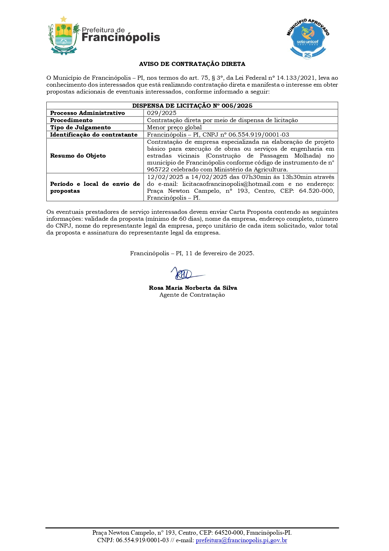 O Município de Francinópolis – PI, nos termos do art. 75, § 3º, da Lei Federal nº 14.133/2021, leva ao conhecimento dos interessados que está realizando contratação direta, conforme informações abaixo: