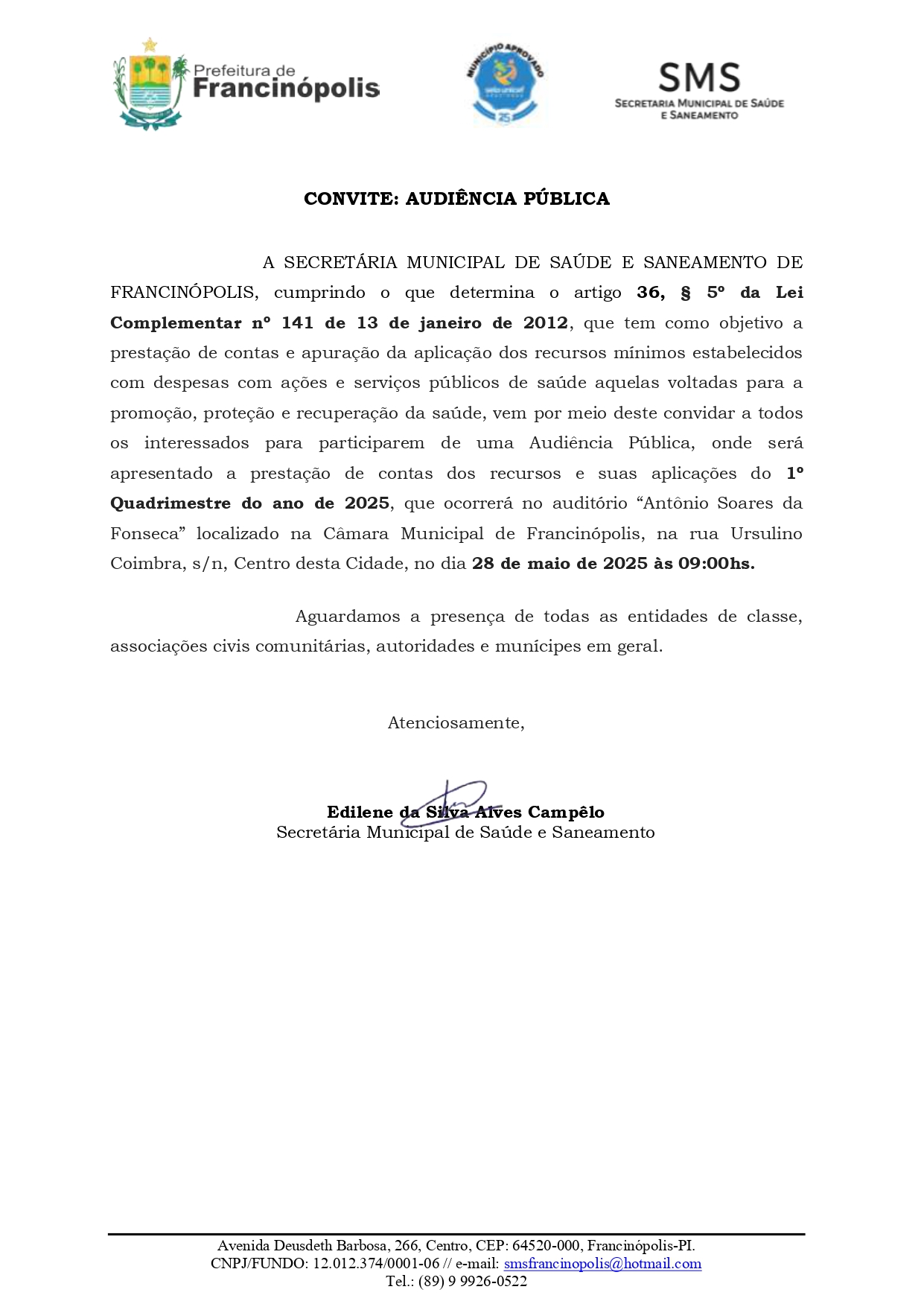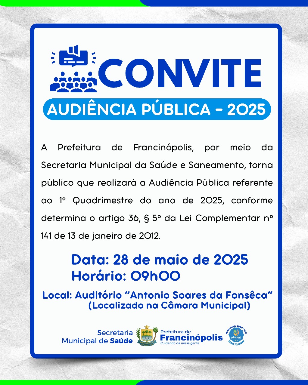 A Prefeitura de Francinópolis, por meio da Secretaria Municipal de Saúde e Saneamento, realizará no dia 28 de maio de 2025 uma Audiência Pública para apresentação da prestação de contas dos recursos aplicados na saúde durante o 1º quadrimestre do ano.