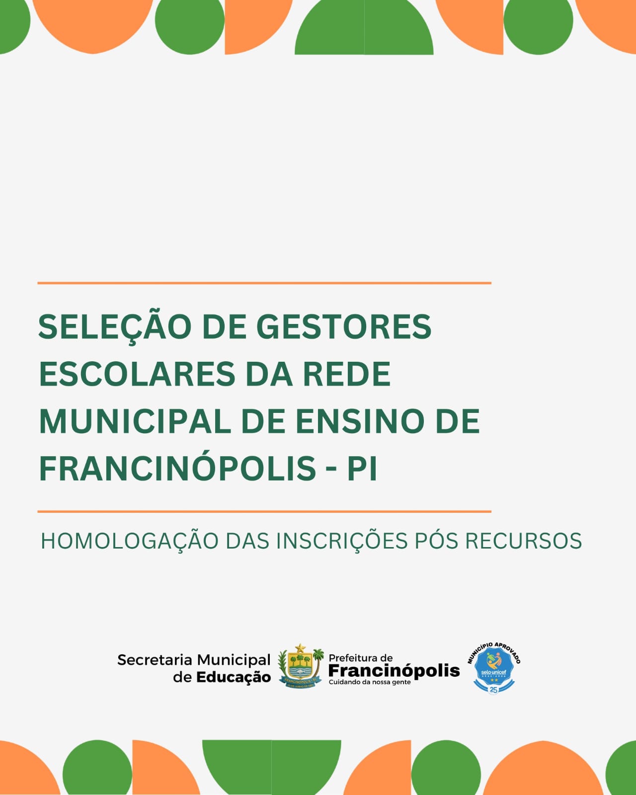 A Secretaria Municipal de Educação – SEMEC, por meio do Instituto Ipê Castelense e da Comissão do seletivo, no uso de suas atribuições legais, torna pública a Homologação das Inscrições pós período para recursos do edital SEMEC Nº 01/2025, referente ao processo de seleção de profissionais da educação para ocuparem a função de Gestor Escolar das escolas públicas municipais (Unidades Escolares e Centros Municipais de Educação Infantil) da Rede Pública Municipal de Ensino de Francinópolis.